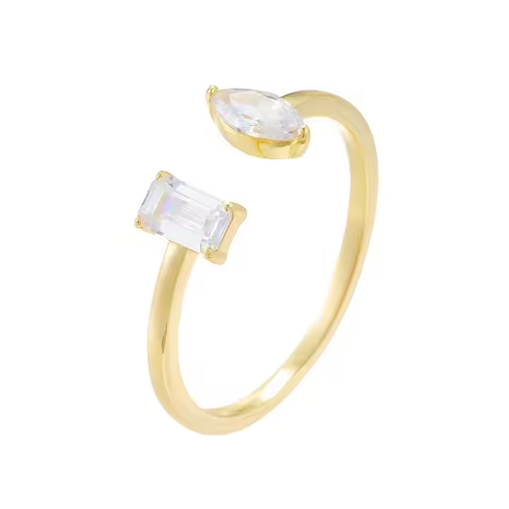 Modern minimalism meets subtle sparkle in this open-style ring. Crafted in 14k gold plating over 925 sterling silver, it features two distinct stones — a marquise-cut and a baguette-cut cubic zirconia — set at each end of the band. The contrasting shapes create an effortlessly chic look that’s perfect for stacking or wearing solo.